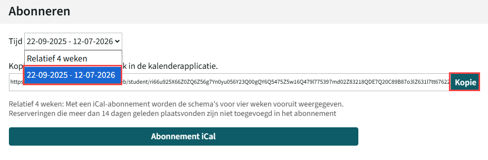 Selecteer eerst de periode waarvoor je de kalender wil synchroniseren door de data aan te passen. Klik vervolgens op “Abonneren” indien je het rooster wilt synchroniseren met je favoriete kalenderapplicatie (MS Outlook, Google Calendar, Apple iCal etc.)