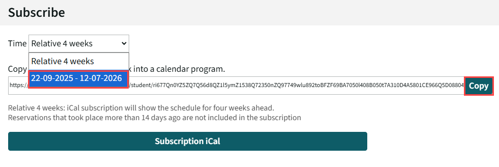 First select the time frame that you want to synchronize by changing the dates. Click on “Subscribe” if you want to synchronize your time table with your favourite digital calendar (MS Outlook, Google Calendar, Apple iCal etc.)